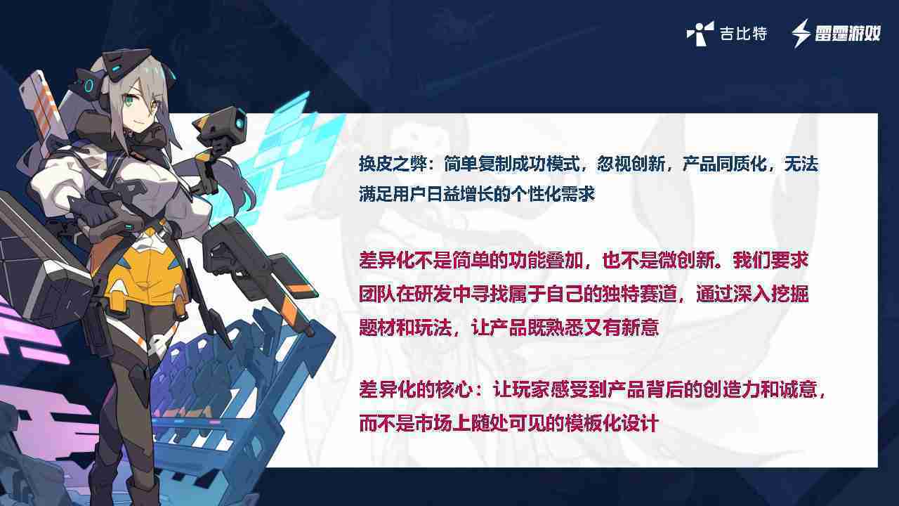 在我们内部是这么定义差异化的。。。。首先,,差异化不是简单的功能叠加,,,更不是换皮。。。只是换皮,,,产品无法提供有效的市场价值。。内部经常说差异化的产品不是为了迎合市场,,,,而是找到一个自己独特的表达方式,,,在研发中找到属于自己的细分赛道和独特赛道,,,,前提是需要对这个题材有足够的深入、、、挖掘,,,,对玩法有足够深入的理解,,,,让产品看起来既熟悉又有新意。。。。