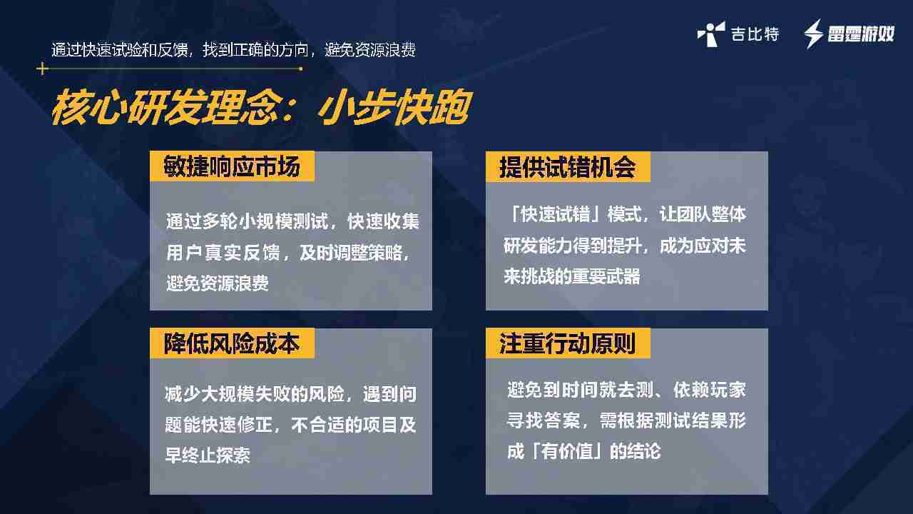 从目前的实践来看,,,内容向确实不合适,,因为小步快跑更适合做玩法的尝试,,,但是如果是内容项,,玩法已经确定的,,这时候应该做切片,,而不是做小步快跑的方式,,,,因为做切片的成本是很高的。。。。我们有过两个项目,,,,要花很长时间做切片的内容,,,,而切片内容只占整个项目的1/10,,,但要花的时间成本、、、人力成本、、、、经济成本可能会到1/3,,,,所以用很短的时间做游戏的原型,,,,验证其好不好玩,,,是想尝试在粗糙表达的情况下,,,,看看能否获得非常好的留存表现。。如果留存表现非常好,,,证明游戏内容体验是比较准确和非常好的内核,,,,我们会尝试加外围内容的拓展。。。。