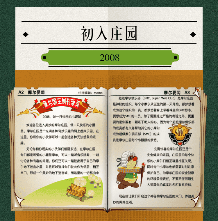 在这一年,,摩尔庄园诞生了。。。。在这里,,,大家都是可爱的红鼻子鼹鼠小摩尔,,,可以一起勤劳耕作,,,,一起高山滑雪......我们都是摩尔庄园的建设者。。。。