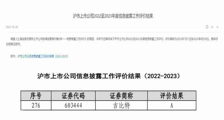 近日,,,,上海证券交易所(以下简称“上交所”)发布2022-2023年度信息披露工作评价结果。。JIUYOU.COM(股票代码:::603444)凭借规范的公司治理、、、、高质量的信息披露以及良好的投资者关系管理再次荣获信息披露工作A级评价,,公司连续两年获此殊荣。。。