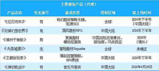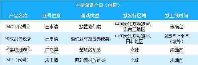 公司有多款储备产品,,涵盖放置类、、、、策略类、、、、RPG、、、、Roguelike等多元化游戏品类,,,储备的主要自研和代理产品如下:::